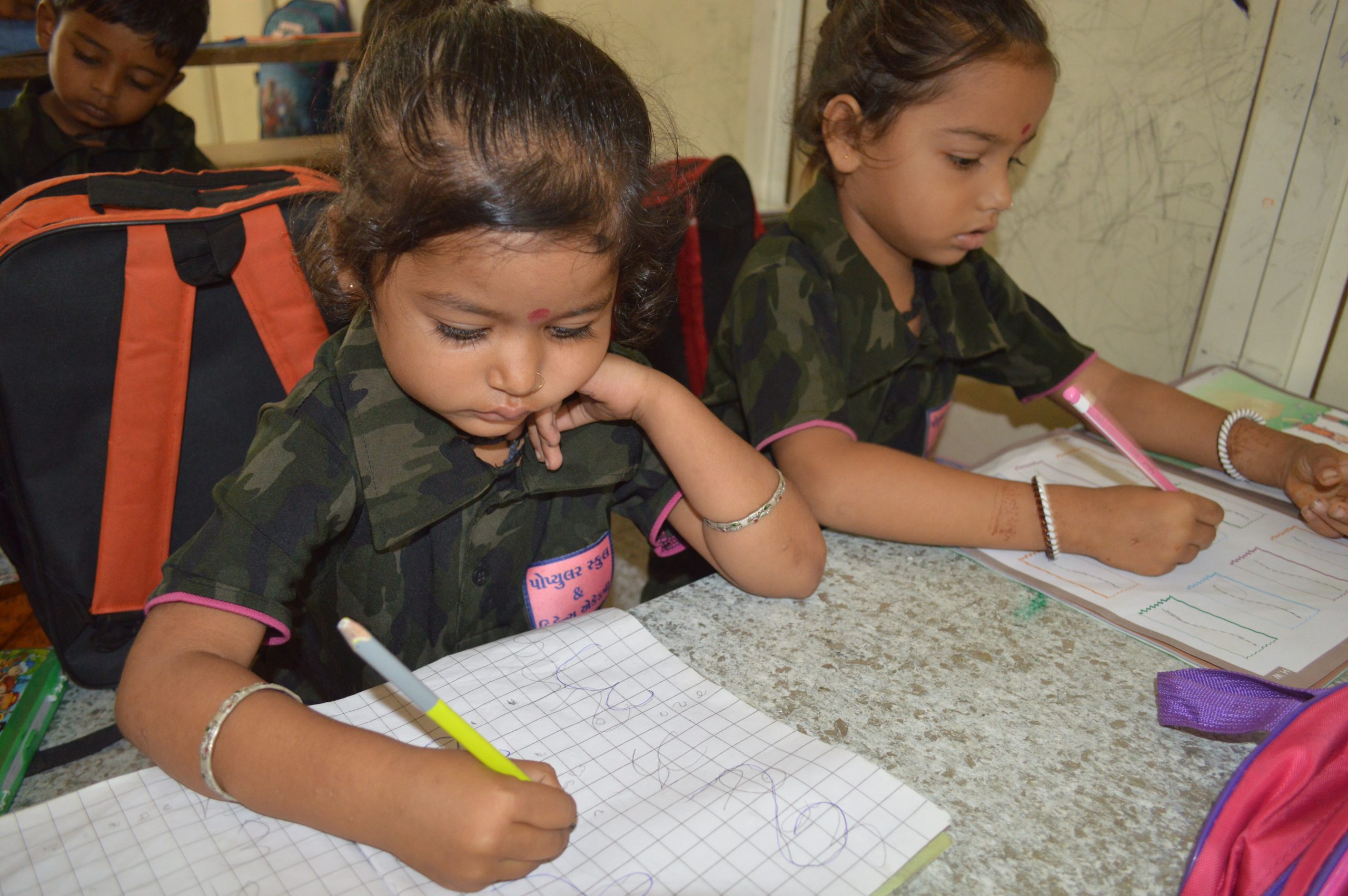 Inspired by Shri Mukeshbhai Vasani, AIMTRON Foundation (USA) runs a playhouse at Popular School, offering free foundational education for children aged 4 to 6 in both Gujarati and English mediums.