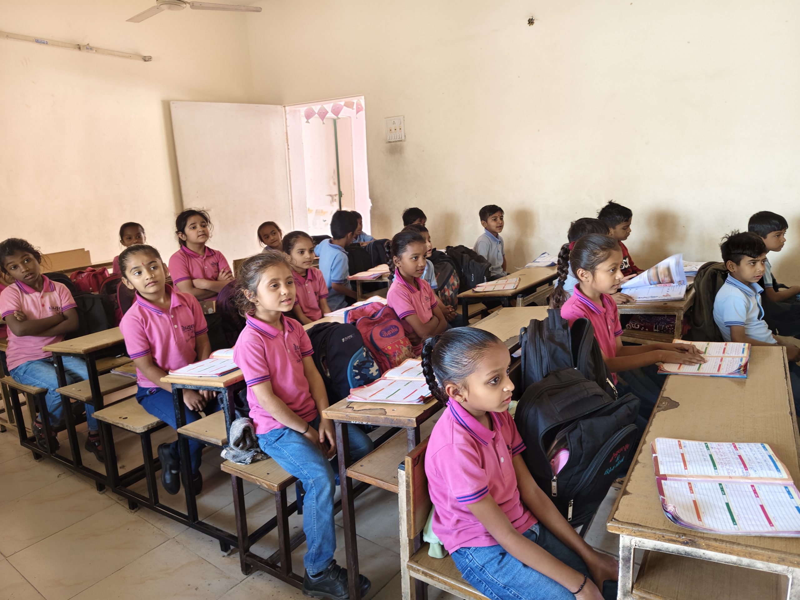 Inspired by Shri Mukeshbhai Vasani, AIMTRON Foundation (USA) runs a playhouse at Popular School, offering free foundational education for children aged 4 to 6 in both Gujarati and English mediums.